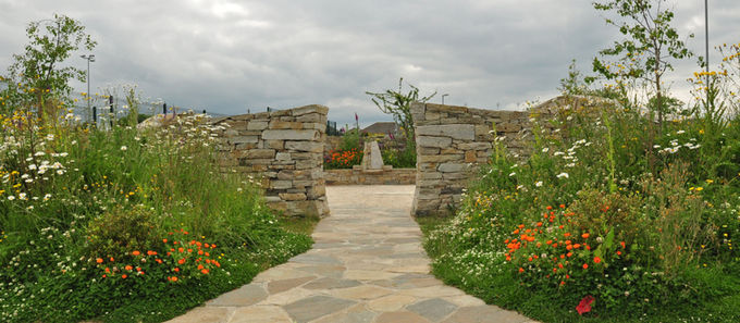 The outdoor classroom consists of a walled garden type structure. The walls are comprised of dry faced stonework, inspired by the ancient traditional dry stone walls found throughout the country. Taking inspiration from the four strands of the learning spiral from the school ethos, the centre of the structure is a large spiral incorporated into the floor and walls. The first strand of the spiral is already visible as you walk towards the classroom. It spirals first along the ground, then into the wall, before curling up to create the arched entrance into the classroom. Similarly, another of the strands runs into the wall, curling up to form the border of the family tree mosaic. Yet another strand finishes at the teacher’s stone chair, with the fourth strand of the spiral turning into the path of the exit from the classroom.